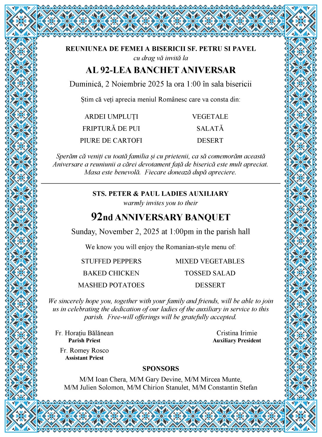 Everyone is invited to join us for our annual Ladies Auxiliary Anniversary Banquet, celebrating 92 years of our parish’s beloved women’s organization, on Sunday, November 2, following the Divine Liturgy. We will again be treated to a delicious menu. See flyer for details.