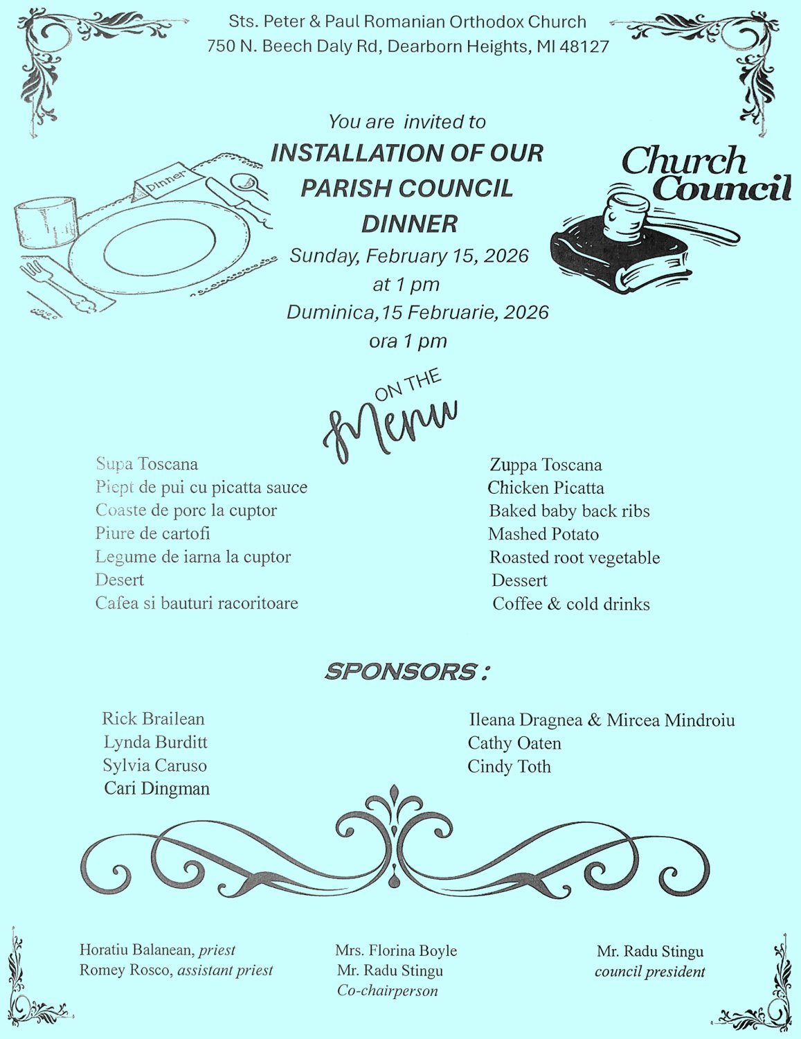 Everyone is invited to join us for our annual Installation of Officers Dinner, celebrating the new year and election of the new officers of our parish council and auxiliary organizations, on Sunday, February 15 following the Divine Liturgy.